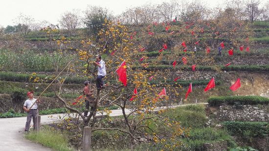 国庆节到来之际,天台县雷峰乡茶丰村柿农用国旗装扮柿园,成为一道独特的风景。最近,该村近2000亩红朱柿喜获丰收,一时成为乡村休闲游的热点。