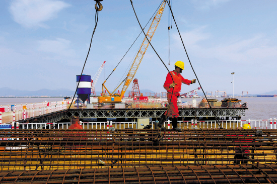 10月2日是国庆长假第二天,台州湾大桥的全体建设者放弃休假,奋战在一线,用实际行动向祖国献礼。图为工人正在施工。