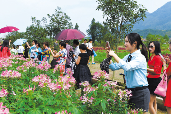 10月2日,一群市民在临海市江南街道上江村百花园中的百合花、醉蝶花坛前合影。国庆期间,该村的上百亩花卉开得正旺,把整个乡村装扮成了花的海洋、欢庆的世界,许多市民带着家人前来赏花。