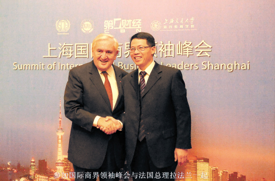 图为国际商界领袖峰会上,黎贤钛(右)与法国前总理拉法兰在握手。 (资料图片)