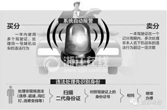 杭州公安官方微信介绍,如果一本驾驶证在一个记分周期内,处理非本人名下机动车的违法行为超过一定次数,或一年内使用多个(超过3个)驾驶证处理同一号牌机动车违法行为,那么驾驶人办理业务时系统将自动报警。