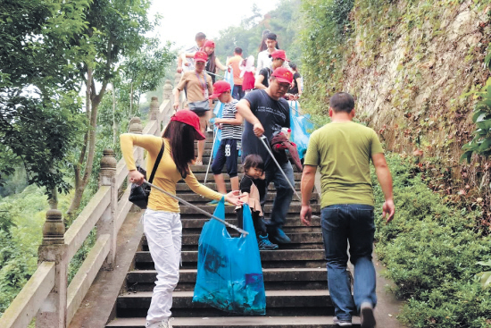 “十一”期间,松门义工队每天派出20多名队员带着超市塑料袋来捡垃圾。