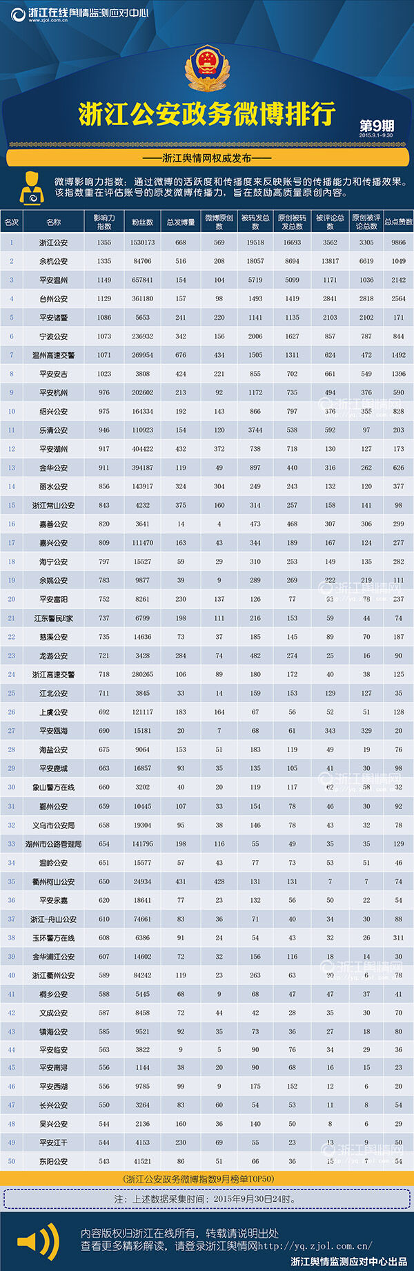 9月,全省11个地市公安机关政务微博运营整体良好。在参与排行的123个账号中,温州、台州、宁波、杭州、绍兴五地公安政务微博进入前10名,其中“平安温州”重新回升至第3名,“宁波公安”则下降3名,退至第6位,本期“台州公安”表现抢眼,在经过一月的沉寂之后,重新回归前十位居第4。“平安杭州”、“绍兴公安”分居第9、第10名。湖州、丽水、金华进入前15,嘉兴位列第17,“浙江-舟山公安”、“浙江衢州公安”表现依旧低迷,排名第37、第40位,与其他地市进一步拉开差距。单项排名方面,“平安湖州”继续领跑总发博量和微博原创数;“平安温州”在被转发总量上表现优异,被评论总量方面则被“台州公安”夺得榜首。在各地市公安机关政务微博中,“丽水公安”是惟一一个原创率高于90%的账号,值得鼓励,若是今后能提高原创微博的质量,其综合排名或将进一步提升。