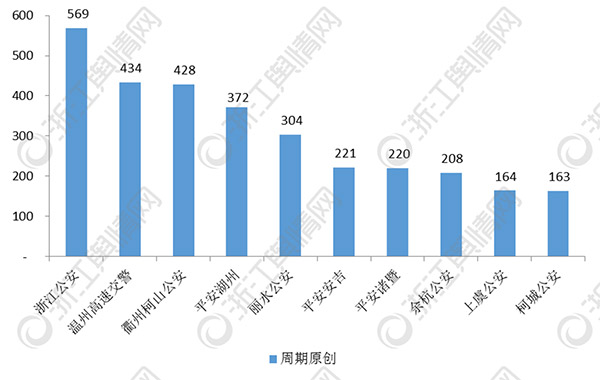 “浙江公安”扩大领先优势。9月,123个账号发博总数和原创发博量较上月均有小幅下降:共发微博12595条,其中原创微博数6822条。“浙江公安”发挥稳定,以569条发博量在微博原创量上夺魁,且与次席的“温州高速交警”相比,其领先优势有所扩大。从发博量上看,“温州高速交警”的榜首地位依然不可撼动。对比两期原创微博榜单发现,榜单成员构成相对较为稳定,本期仅有“柯城公安”新晋入榜。