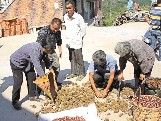 桥棚村种植板栗已有600多年历史,目前有2000余亩栗树,树龄在300年以上的板栗树有140多株。眼下,正值板栗丰收季节,栗农们起早摸黑,到山上采摘板栗,运回家脱去刺壳,然后外出销售。