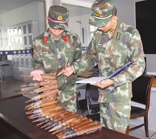 经鉴定,这些炮弹是军舰上的炮弹,虽然表面已锈蚀,但仍具有杀伤力。图为民警对收缴的炮弹进行登记。