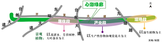 根据自然环境和产业定位的不同分类决定植物品种。其中,居住段主要以花灌木、芳香树种、大叶落乔为主;产业段以生产性作物和观赏花卉为主;湿地段则主要以水质处理的湿生植物为主,通过植物的阻滞作用达到净化改善水质的目的。