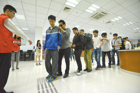 昨天上午,在台州市图书馆的无障碍图书室里,10多名盲人正在这里进行盲道接力比赛。10月15日是第32个国际盲人节,市图书馆和台州义工协会特别邀请了椒江盲人协会的14名盲人,参加专门为他们举办的盲道接力赛、听声辨歌曲、收听无障碍电影等各项趣味活动,与盲人朋友们共度欢乐时光。