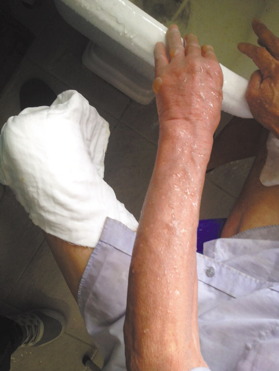 子女们赶来看到,老人家除了头发眉毛有些焦黄,手臂上有些烫伤,老人原本以为不打紧,去紫阳街找点烧伤药涂上就好。没想到找了几家店,都表示情况并没有想象中简单,因为老人当时穿着腈纶裤子,遇火后收缩,又烧伤了腿上皮肤,只能住进台州医院。