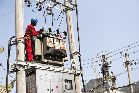昨日,临海市供电公司电力工人正在涌泉镇前坊村地段,对10千伏南屏191线涌泉03公变进行移位改造抢修。据现场负责人介绍,从早上6时开始,该公司10多名施工人员便进行线路切割、导线架设、变压器移位等工作。预计当日18时,该路段附近区域线路将恢复通电。