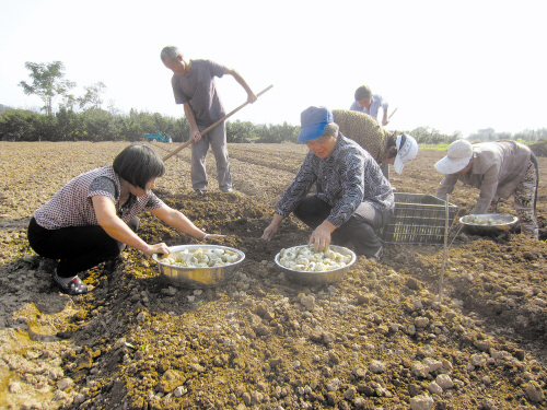 10月14日,临海市白水洋镇琳山百合基地20多位民工正忙着赶种百合。该基地负责人朱宏卫说,首期投资上百万元,从广西引进了7000多斤龙牙百合种子,以琳山为依托,打造生态观光农业。