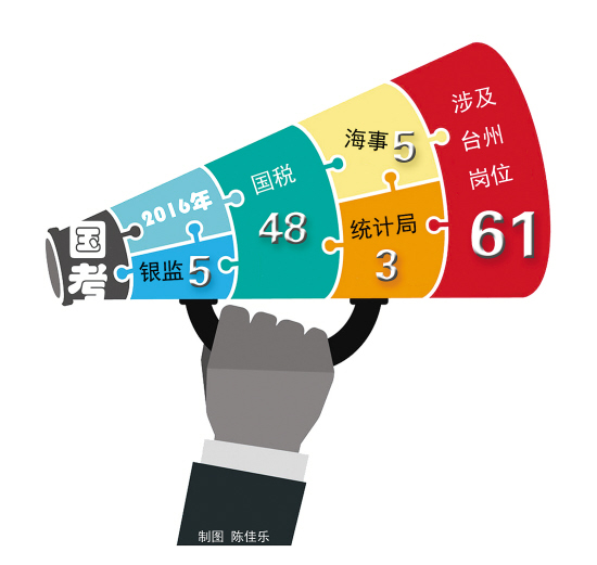 昨日,记者下载《中央机关及其直属机构2016年度考试录用公务员招考简章》后,初步统计了一下,涉及台州的岗位有61个,包括国税、海事、统计、银监等部门。其中,国税部门招聘最多,台州市、县两级国税一共设置48个岗位,招聘60多人。