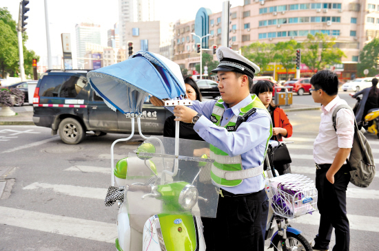 从今年8月17日开始,温岭市交警大队对违法安装遮阳伞开展了整治行动。在前期整治中,交警对被查到的非法安装遮阳伞的电动车、摩托车主,耐心讲解安装遮阳伞、遮阳棚所存在的安全隐患,劝车主回家后自行拆除。