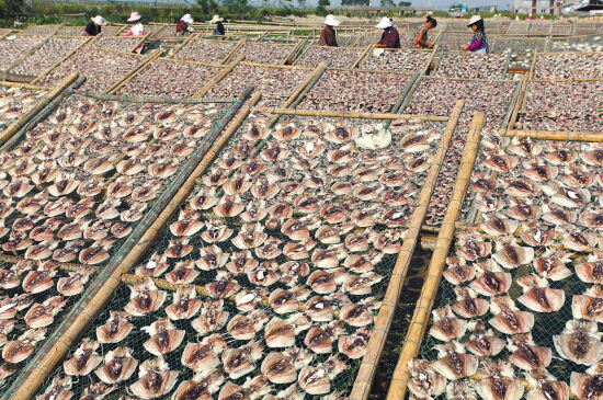 进入10月中旬,天气晴好,又刮着东北风,是渔民们翻晒鱼鲞的好时节。10月13日下午,笔者来到了素有“中国白鲞之乡”和“中国鱼鲞之乡”的温岭市松门镇,只见坐落在北沙村的水产加工园区里,各家各户都在忙着加工生产鱼鲞制品。远远看去,场面非常壮观。晒鱼鲞已成为当地一道亮丽的风景。