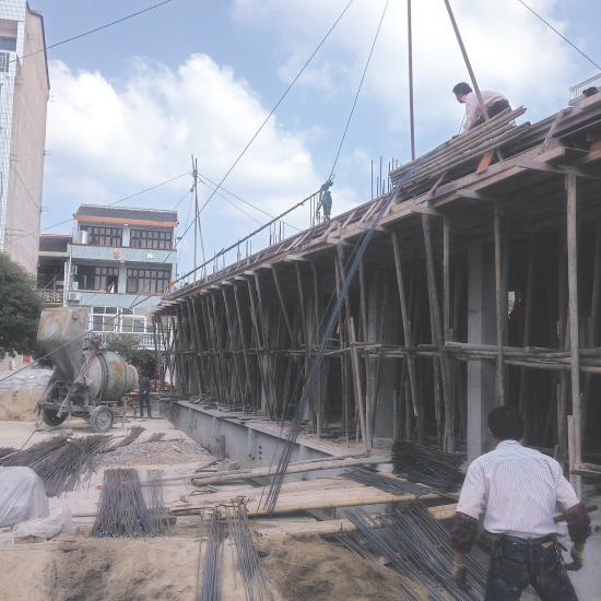 潘先生所说的民房,位于杜桥镇杜川路新华书店对面的长乐巷内,共八间。房子已建好一层,正在建设第二层,现场有不少施工人员正在忙碌。房子前的村道上,堆满了钢筋、砂子等建筑材料。