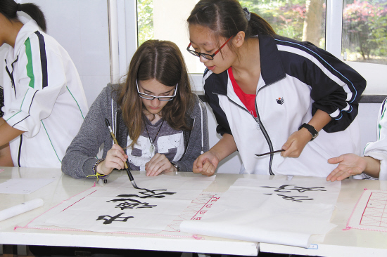 王万林介绍,帕米娜高级文理中学共来了18位师生,其中学生14位。学校除了让德国学生参加课堂学习外,还专门安排了游览、参观、实践等活动。“既游览了黄岩当地的九峰公园、永宁公园、柑橘博览园,也带他们去了天台国清寺、吴子熊玻璃艺术馆等地方。同时还举办了文艺晚会、书法练习、越剧学唱、趣味体育竞赛等活动。德国师生对这些活动的反响很好,对我们台州的印象也很深刻。”