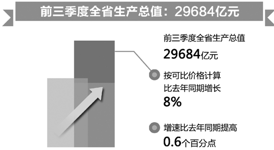 数据:前三季度,全省生产总值29684亿元,按可比价格计算,比去年同期增长8%,增幅比去年同期提高0.6个百分点。
