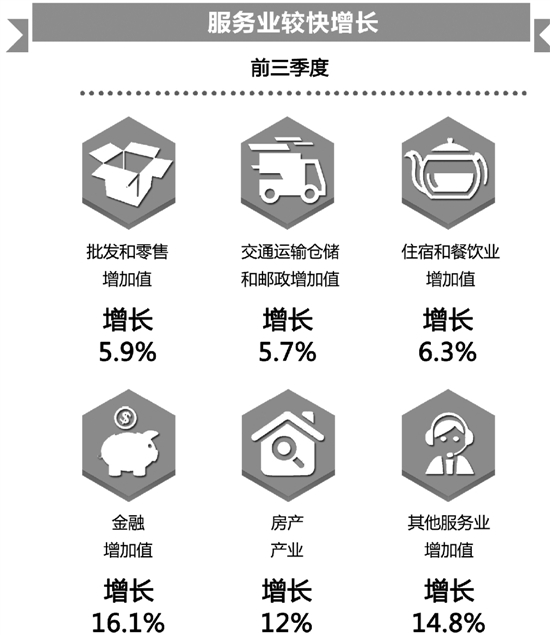 根据统计,前三季度,服务业增加值比重为50.1%,拉动GDP增长5.3个百分点,对GDP的增长贡献率达66.4%。