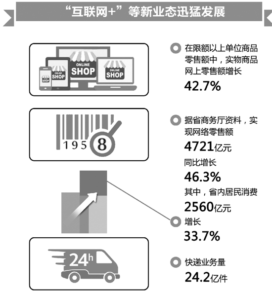 “互联网+”等新业态迅猛发展。在限额以上单位商品零售额中,实物商品网上零售额增长42.7%。据省商务厅资料,实现网络零售额4721亿元,同比增长46.3%,其中省内居民消费2560亿元,增长33.7%。
