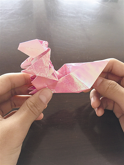 “当时,学习折鲸鱼时,就被鱼头部的一个关卡困了好几天,怎么摸索都找不到方法。”“死磕到底”的邱敏健愣是不放弃,直到找到方法,倒要被自己气哭了:“牵一发而动全身,我把峰线和谷线弄反了,折出的效果就完全不同。”