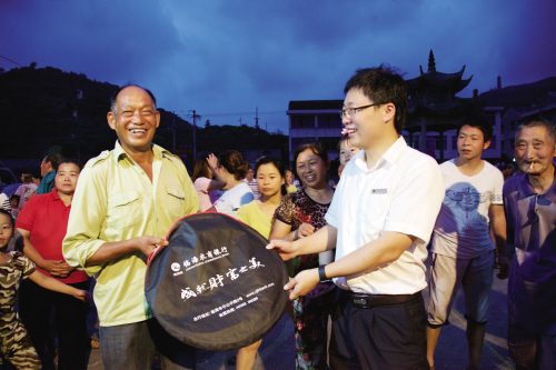 临海农商银行客户经理为参与“金融直通车·微讲堂”的农户送上礼品。