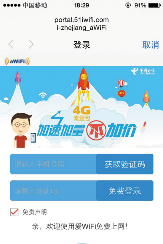 而登录“i-zhejiang_awifi”后手机弹出了中国电信“awifi”的登录界面,经过手机号码认证后,成功获取了无线网络,在线观看时长约3分钟的短视频,播放十分流畅。