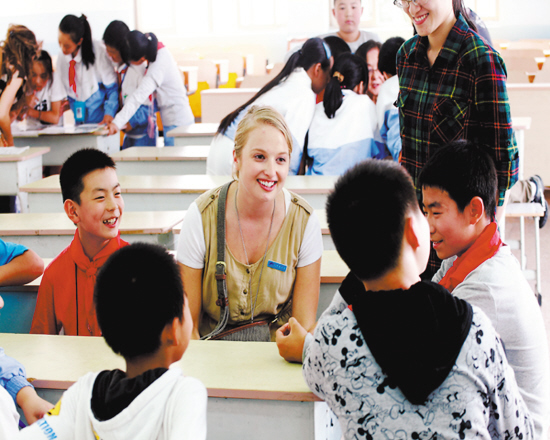 到访椒江区人民小学的美国专家在活动课上与孩子们互动。佚名摄