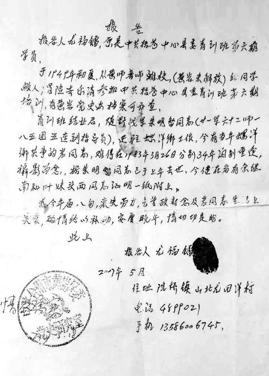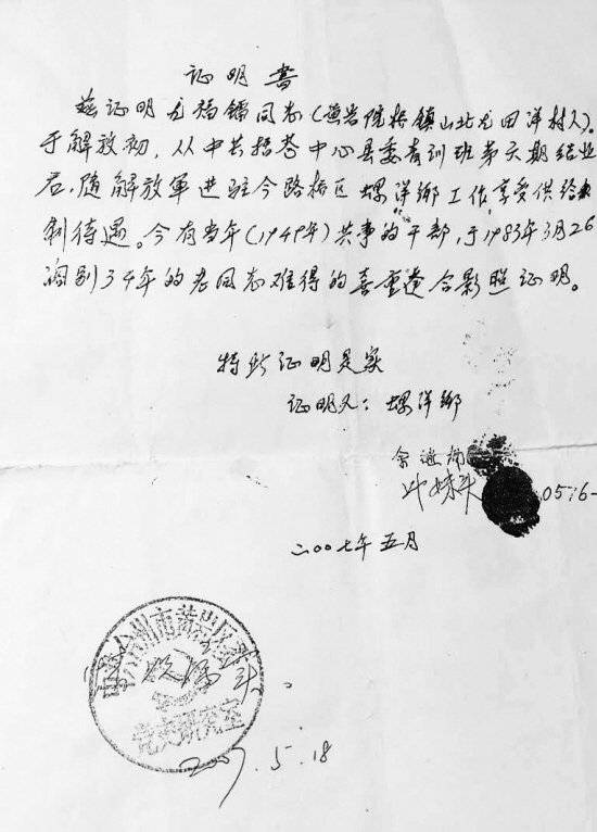 青训班结业后,尤福镭跟随野战军朱明智同志(廿一军六十二师一八五团五连副指导员),进驻当时的螺洋乡工作。