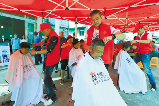 10月21日,台州市慈善总会的义工来到黄岩上垟乡大岩村,为当地140多名老人理发、义诊、包饺子等,祝他们节日快乐,健康长寿。本报记者牟永选摄