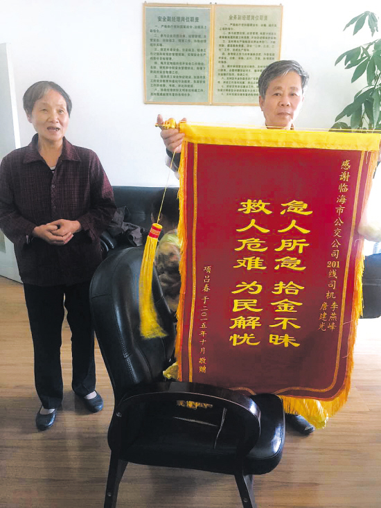 昨天下午,椒江的项大爷和老伴拎着面锦旗,来到临海客运中心办公室,一定要交给201路公交车司机李燕锋和詹建光。项大爷说,要不是两位师傅热心帮忙,老两口那2万元救命钱,可就没着落了。
