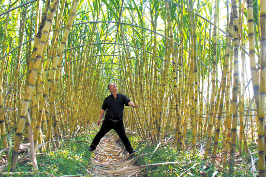 10月19日,在温岭市新河镇新联村,果农王德志正在观察大棚果蔗的高度。去年,王德志试种4亩大棚黄皮果蔗,经过10个月的精心管理,眼下果蔗身高已约3米,被客商以每株6元的价格订购。如此,亩均收入2万元,较露天果蔗效益增加2倍。