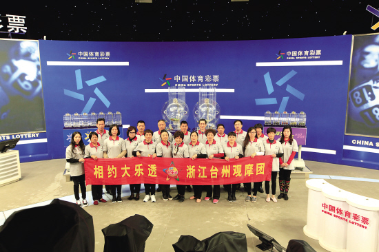 10月26日晚上,在中国体育彩票开奖演播大厅,来自我市的彩民观摩团亲历开奖全过程,并在现场合影留念。当晚,由台州市体彩中心组织、台州彩民代表等一行24人组成的观摩团,走进位于北京丰台区的中国体育彩票开奖演播大厅,成为编外的公证员。工作人员对超级大乐透和排列3排列5的摇奖机进行了测试,彩民代表近距离监督,切实体验到了体育彩票开奖的“公开、公平、公正”的全过程。
