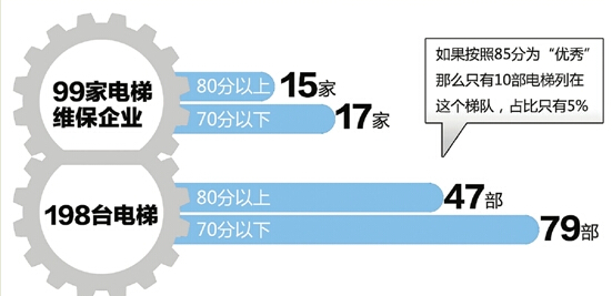 这是一个无法让人放心的数字:抽查了99家电梯维保企业,综合得分80分以上的只有15家,综合得分70分以下的有17家。抽查电梯198部,得分80分以上的47部,得分低于70分的79部。通常得分85分以上,基本没有太出格的问题,可以判“优秀”,那么只有10部电梯列在这个梯队,占比只有5%。