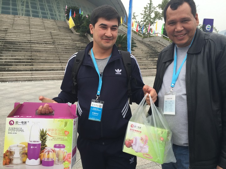 他叫Myrat(左一),来自土库曼斯坦,面对镜头,有些害羞。他今年26岁,来中国一年,汉语却说得麻利。“这里的东西比土耳其便宜很多,我来看看,拍拍照片,传给我家里的朋友,看他们喜欢哪样的,进一些货拿去卖。”Myrat和朋友Arslan主要在义乌做机械、家具方面的生意,他们买了削皮机和榨汁机,准备送给朋友。