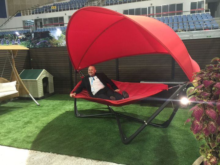 26岁的Hamade,来中国三年了,他几乎把场馆里的每一把椅子都体验了一番。“宝宝喜欢吊床,我看看面料好不好,好的面料就ok。”