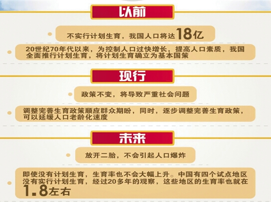 人口政策是国家的基本政策之一,与经济社会的发展密不可分。从上世纪80年代开始实行计划生育基本国策以来,我国的人口政策调整不大。此前的2013年11月,十八届三中全会审议通过《中共中央关于全面深化改革若干重大问题的决定》。《决定》提出,坚持计划生育的基本国策,启动实施一方是独生子女的夫妇可生育两个孩子的政策,逐步调整完善生育政策,促进人口长期均衡发展。