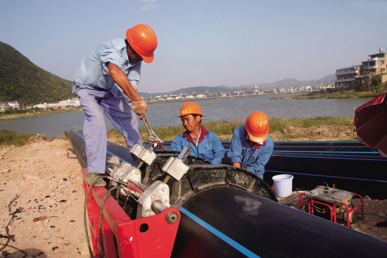 此管是给水用的聚乙烯(PE)管材,规格D800×47.4,长12米,一大卡车满满地载了13条这样的管材。当天,大吊车挥着长臂,把一条条管材有序地安放到指定位置。接下来是烫接管工序,一台大型卧式烫机置放在地面,凭着挖掘机的牵引,两条管的管头被靠在了一起。借助烫机的液压,两管头对正对齐,再用230摄氏度恒温的烫头,对着两管交接处加温,约40分钟,聚乙烯融化后粘合,冷却20多分钟,管与管之间的连接才告成功。