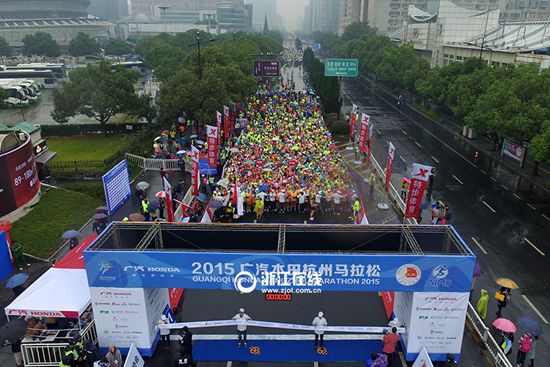 深秋的早晨,细雨纷飞。上午8时,万众期待的2015杭州马拉松赛在杭州黄龙体育中心广场鸣枪开跑。来自美国、法国、奥地利、澳大利亚、阿塞拜疆、中国台湾、中国香港等45个国家和地区的近3万名路跑爱好者参加了5个项目的比赛。
