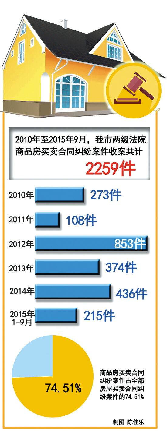 2010年至2015年9月,我市两级法院商品房买卖合同纠纷案件收案共计2259件。2010年收案273件;2011年108件;2012年853件;2013年374件;2014年436;2015年1-9月共215件。