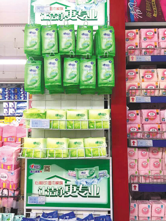 昨天,记者走访了市区多家超市以及各家便利店,发现“榜上有名”的湿巾仍在销售。货架上,被检出含有CIT成分的心相印茶语系列湿巾、心相印卫生湿巾、妮飘方沁湿巾以及启初婴儿湿巾仍在销售。其中妮飘方沁湿巾被摆在了货架最顶端的位置,其余三款湿巾仍在十分显眼的货架层销售,心相印茶语系列在货架上多处铺货,显然是销售量较大的一款湿巾。