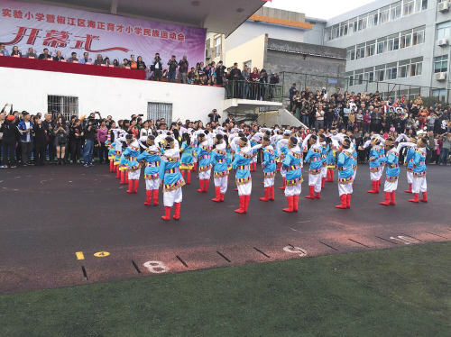 昨天下午,天气并不好,刚开始还飘着小雨,椒江区实验小学的同学们头戴头饰、身着民族服装、脚踩民族特色的鞋靴,顶着微寒,井然有序。