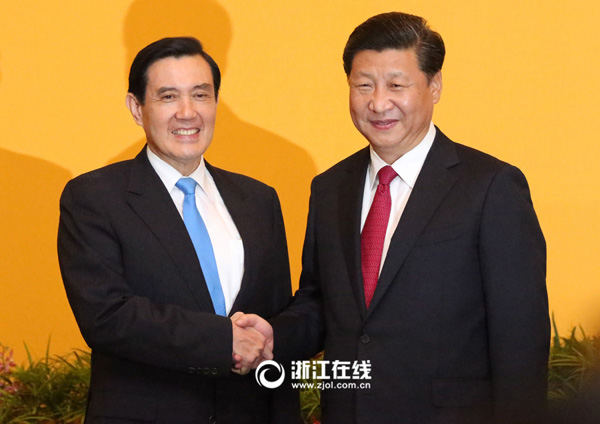习近平马英九进行历史性会面,互称先生,两人握手长达1分10秒,握手后两人一起挥手。(浙报集团特派记者徐斌/摄)