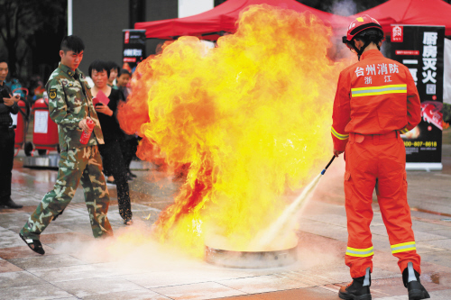 11月7日上午,消防员正在向市民演示灭火器材的使用方法。为迎接第25个“119”全国消防日,当日,市公安消防支队在市民广场举行了“参与社区消防建设平安家园”——“119”大型广场消防宣传活动。活动现场向市民群众展示了最新消防车辆及器材装备,并通过消防知识咨询与有奖竞猜等形式让市民亲身感受消防、积极参与消防。