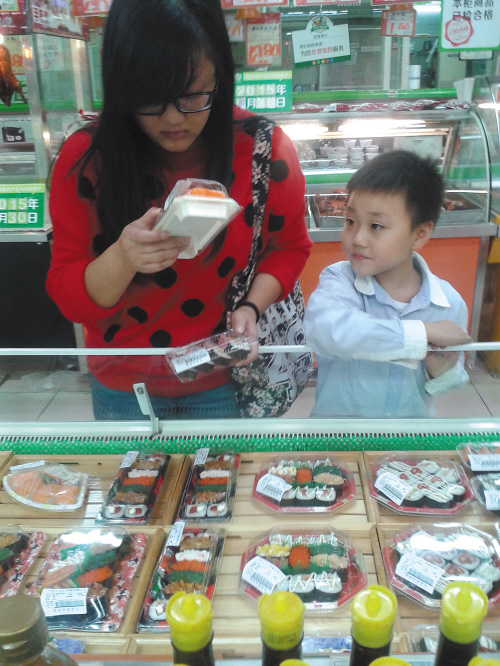10月30日,一些顾客在台州经济开发区世纪联华超市挑选寿司。