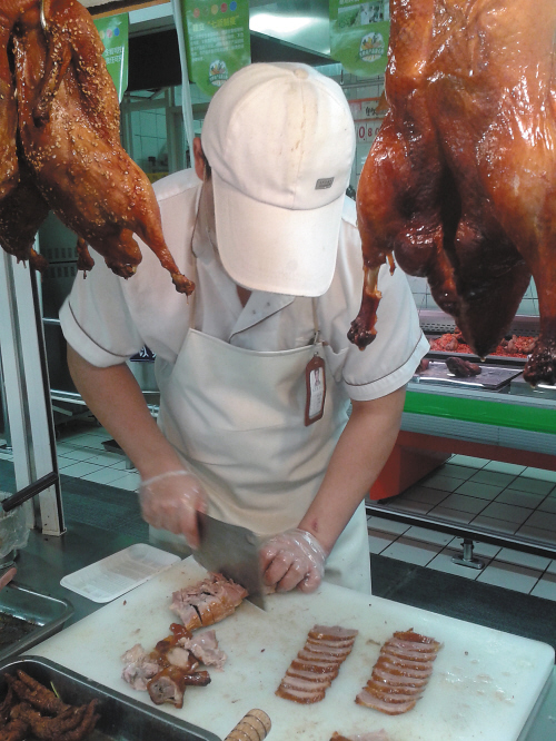 紧挨寿司专柜的,是“祥广源”北京烤鸭,店家是来自辽宁省朝阳市的庞效宗及女友。2014年元旦,他们到超市经营烤鸭、手撕鸡和三鲜素丸子等,每天光顾这儿的顾客很多。