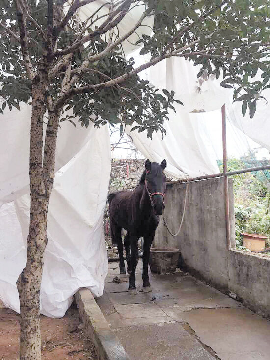 二十多天前,家住温岭肖泉村的郑先生想着骑马可以锻炼身体,就从嘉兴平湖买了一匹马,价值1.5万元。回家后,把马养在宿舍楼前面的院子里,每天好吃好喝照料着,专门托卖菜的老人带萝卜叶子回来,给马当饲料。
