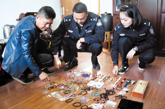 11月9日,临海警方破获系列入室盗窃案件,抓获陕西籍嫌疑人许某。查获的赃物有十只名表,以及钻戒、平板电脑、金银首饰等,价值上百万元,这些赃物足可以开一家名贵的珠宝首饰店。图为11月10日上午,临海市杜桥刑侦中队民警正在清点赃物。