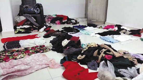 他涉嫌偷盗女士内衣裤,两个月来,偷了好几麻袋,都藏在出租房里,民警连夜数了下,女式内衣裤、外套、丝袜,加起来总共近400件,“可以铺好几个房间。”民警说。当晚,他自己身上穿着的,也是偷来的女士裹胸和内裤。