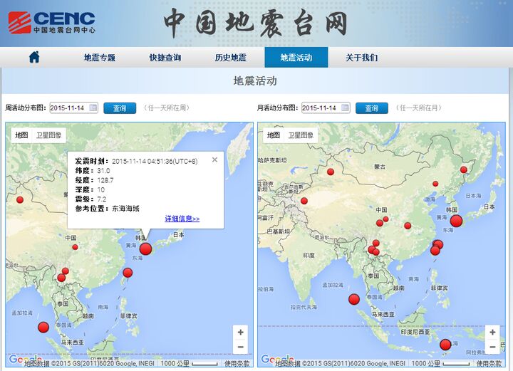 据中国地震台网正式测定:11月14日04时51分在东海海域(北纬31.0度,东经128.7度)发生7.2级地震,震源深度10千米。