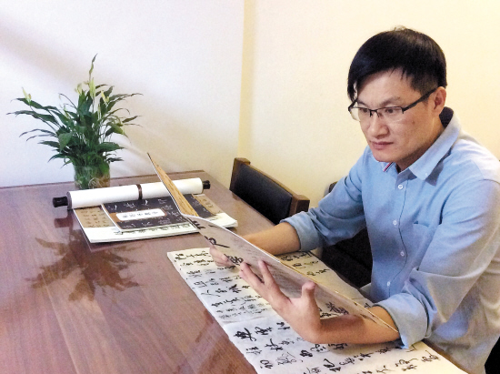 要是走进林占维的办公室,你会看见长长的办公桌上,整齐地摆放着纸墨笔砚。一位身材修长、戴着眼镜、穿着衬衣的年轻男老师,正时而驻笔蹙眉,似有所得,时而奋笔疾书,挥毫泼墨。